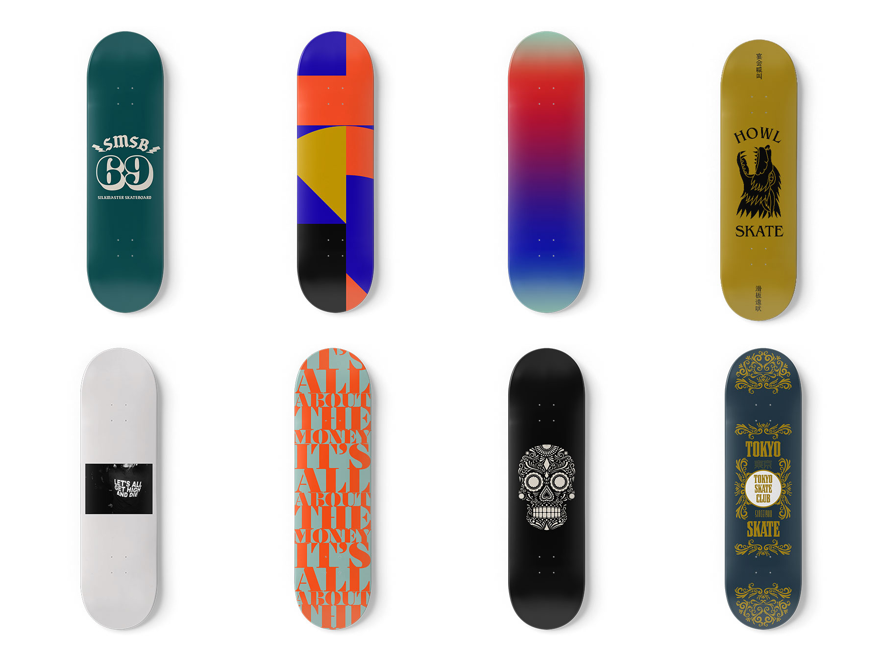 単色、フルカラーなどの技術的特徴を示す制限とイラストレーション、写真のみの構成、タイポグラフィーのみの構成、などのデザイン技法の制限を置いた状態で、スケートカルチャーが反映されたものや、ファッションディスプレイの用途などの目的を想定して12種類のデザインを行いました。