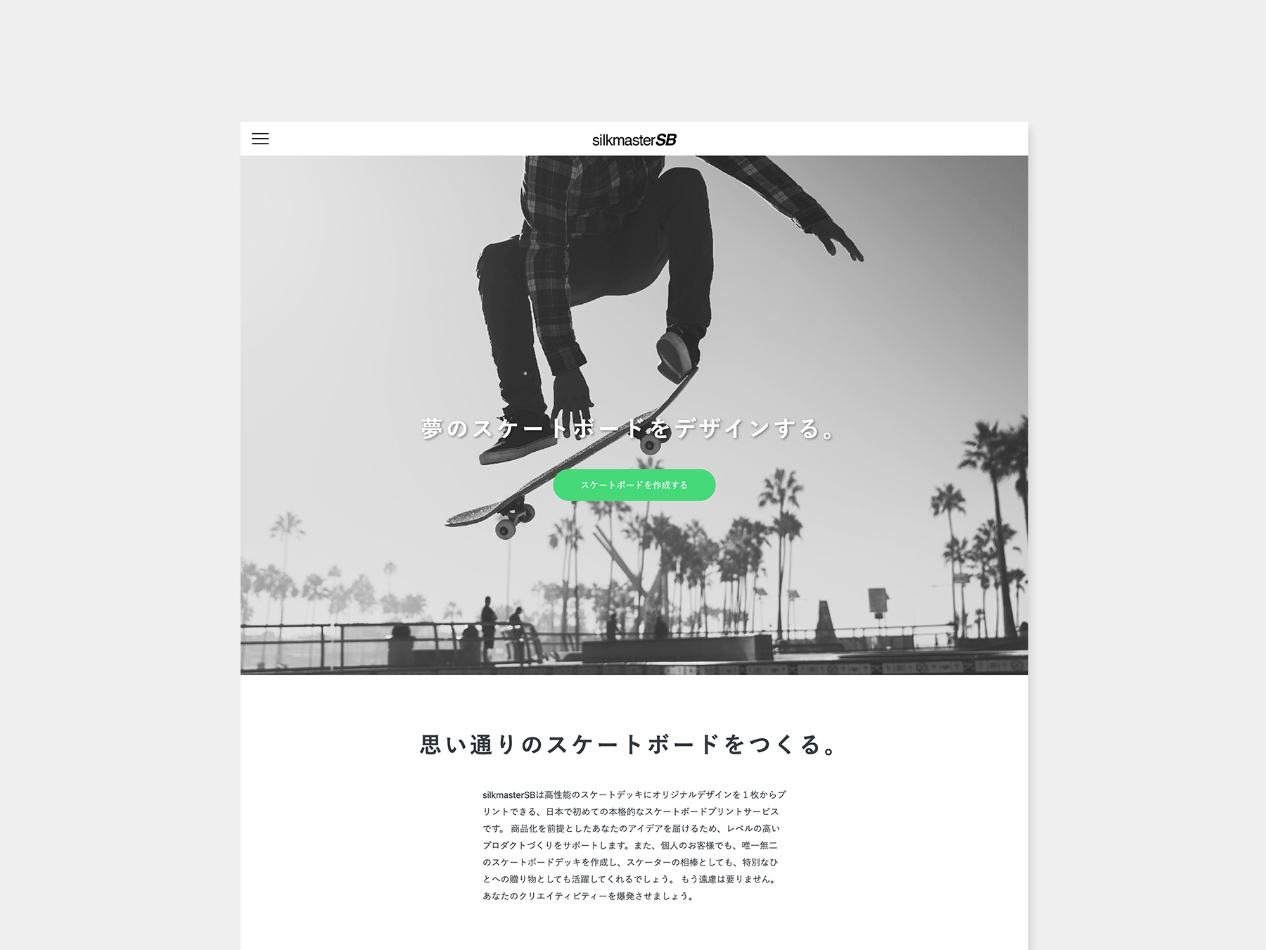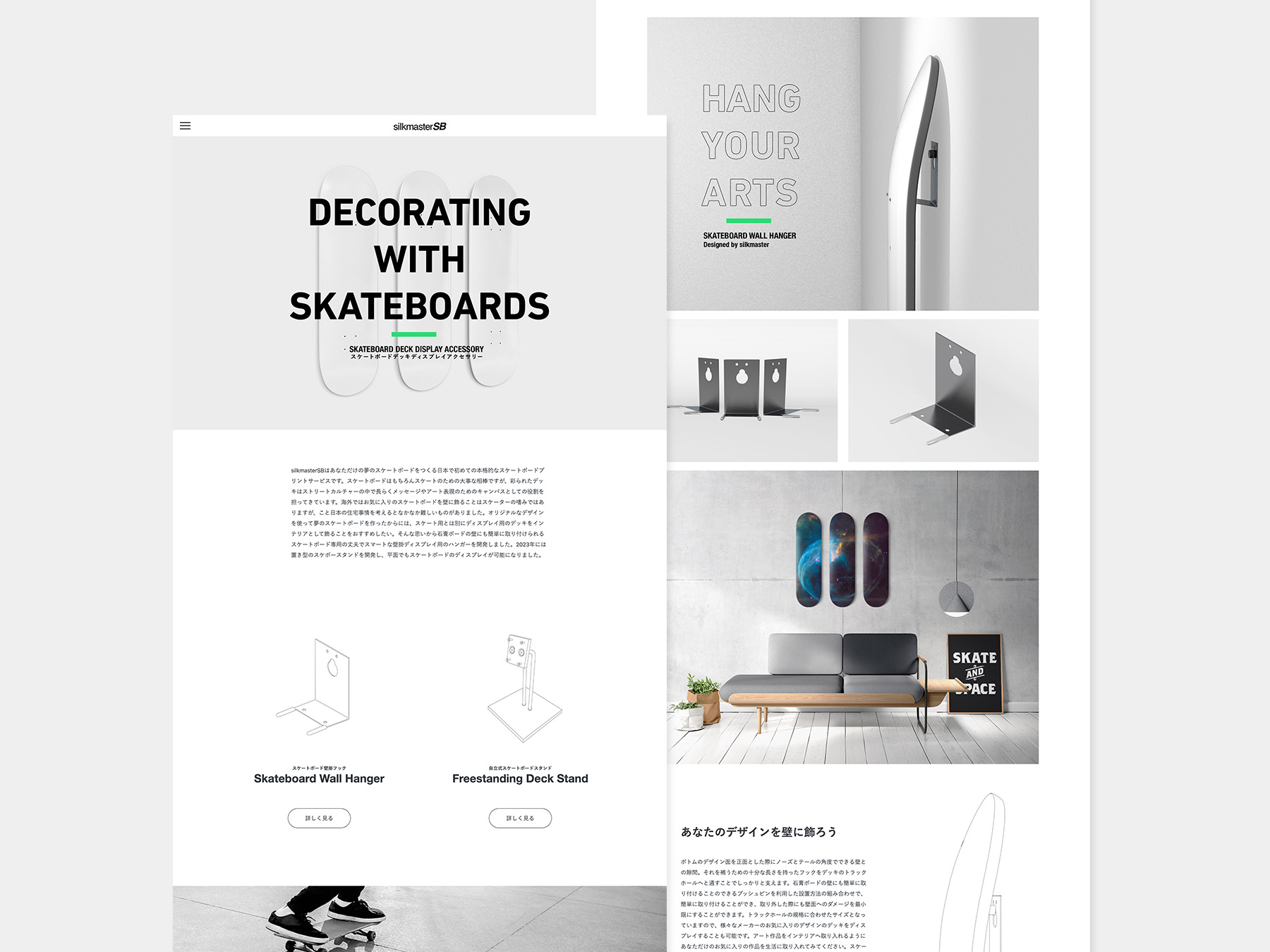 『夢のスケートボードをデザインする。』『思い通りのスケートボードをつくる。』というサービスの一番の目的をキャッチフレーズにして、トリックの成功のイメージ画像とともにトップページに掲げサービスの内容を瞬時に示しています。サイト全体としては、内容に沿ってシンプルかつモダンなサイトデザインを行っています。掲載するデッキデザインのモックアップを様々なカラーやデザインのバリエーションで作成して、それらをエレメントとして使うことで、華やかさを演出するとともに、デザインのバリエーションや方向性をイメージしてもらい、サービスが俯瞰できることを狙っています。
