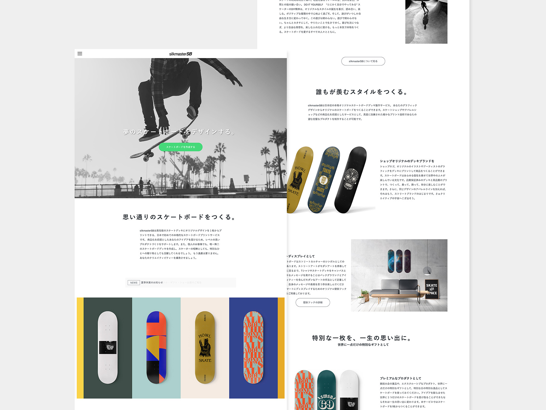オリジナルスケートボードプリントサービスのウェブサイト及びVIの制作。企画からデザイン制作まで担当しました。