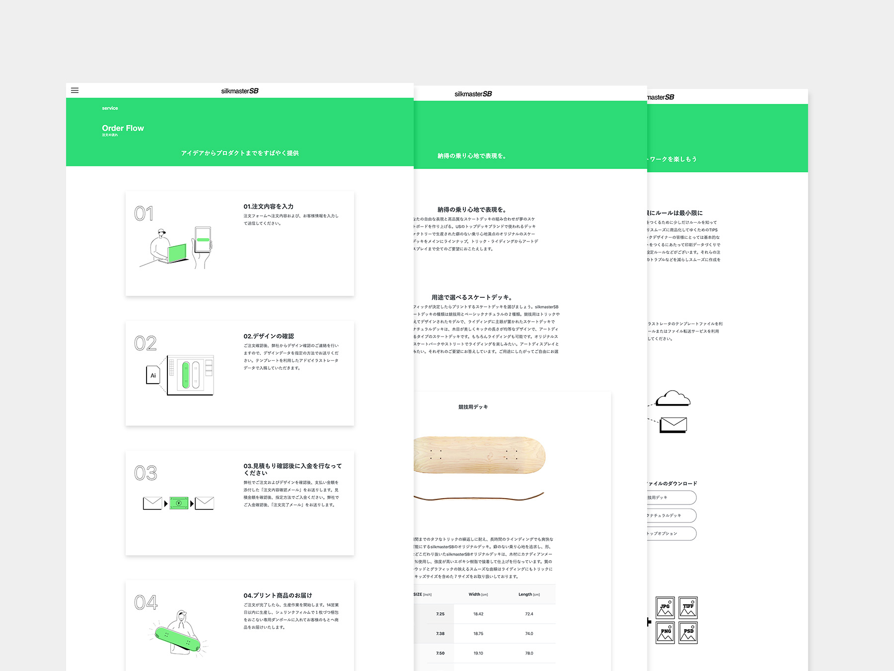クライアントであるアパレルプリントの企業様が新規事業としてスタートするサービスを行うためのウェブサイト制作とVIなどのビジュアライズのご依頼をいただきました。同社でのオリジナルTシャツ作成のサービスを以前より担当をしていたためそれらの知見を見込まれ企画より参加いたしました。課題としては、アパレルプリントサービスは老舗であったのですが、全くの新規ジャンルへの参入ということでプリント技術情報のみが明確でターゲットの選定やアプローチの方法などが未知な部分が多くありました。リモートでのアンケートでヒアリングを重ねターゲットやビジネスフローなどをまとめてゆき、具体的な形でサービスのフローや表現の方向性を言語化して共有して企画を行いました。メインターゲットは、主にスケーターや関連ファッションなどのオリジナルプロダクトのベンダーになり、スケートボードのカルチャーやコミュニティーへの敬意と貢献の姿勢を全面に打ち出して、ビジネス部分であるファッションアイテムとしての利用とカルチャーの軽視が重ならないように配慮したうえで、プロダクトとサービスの特性を説明して利用用途などの提案を行っています。